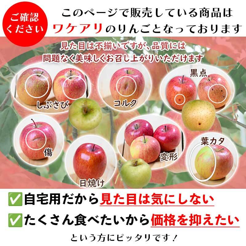 傷、ツル割れ、変形、色むら等がある訳あり家庭用規格となります。傷みやすい部分が含まれる可能性がございます。味は通常のリンゴと違いはございません。予めご了承くださいませ。